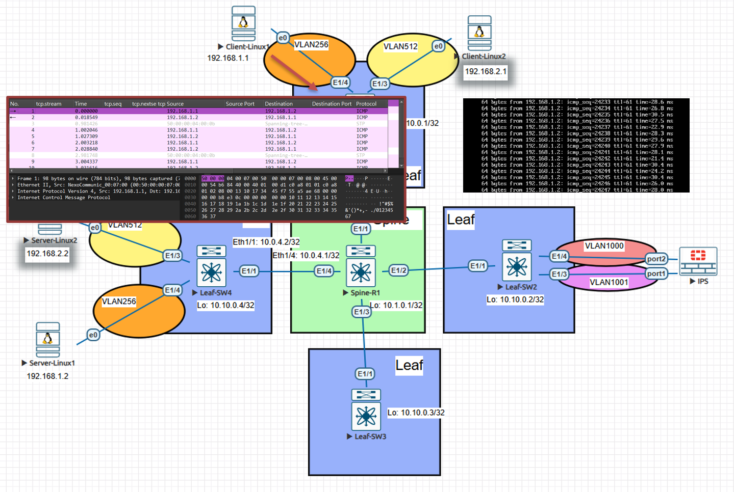 - Packets traverse IPS via VLAN1000 → FortiGate → VLAN1001 before reaching destination.
