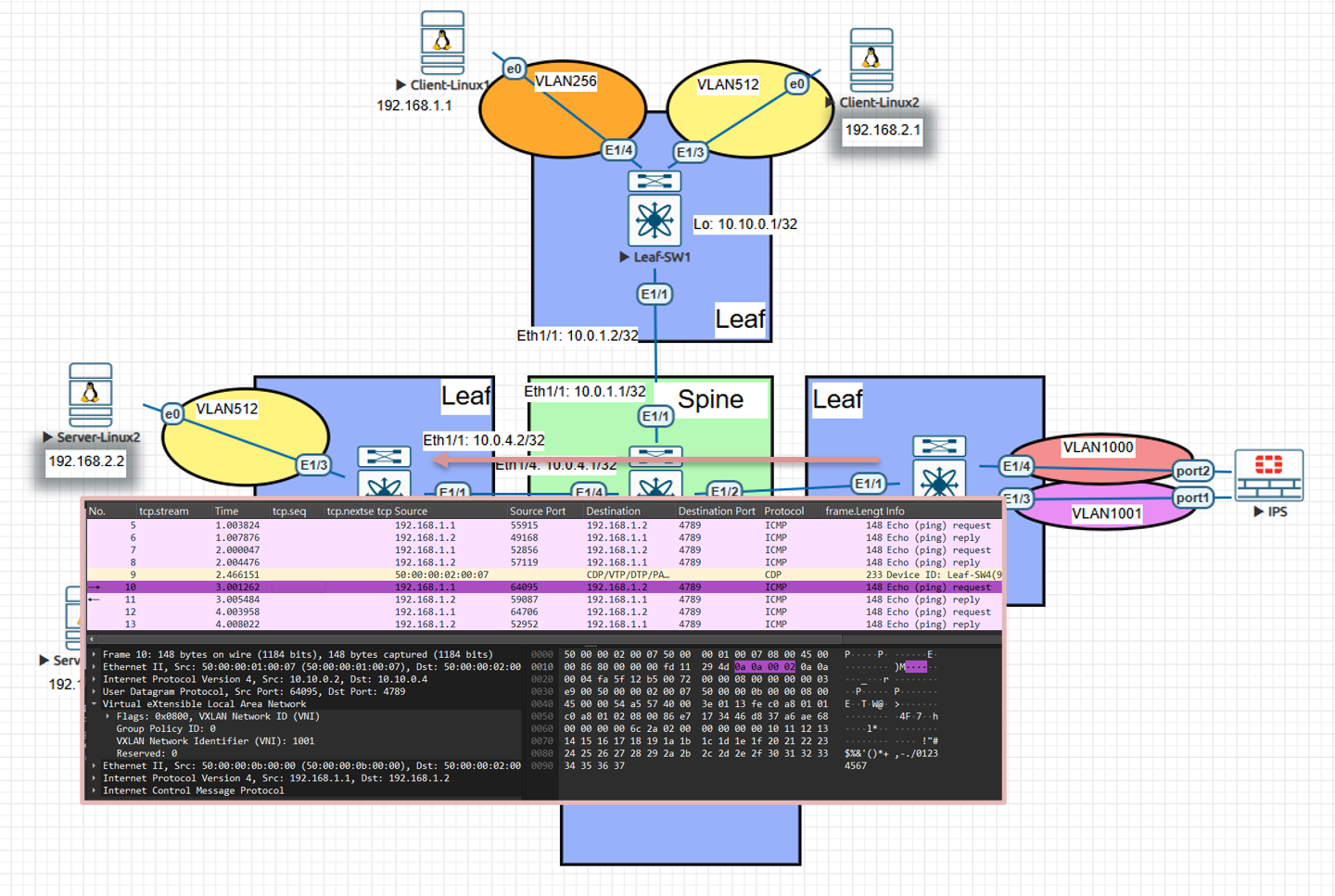 - VXLAN tunnels established between Leaf-1 and Leaf-2.